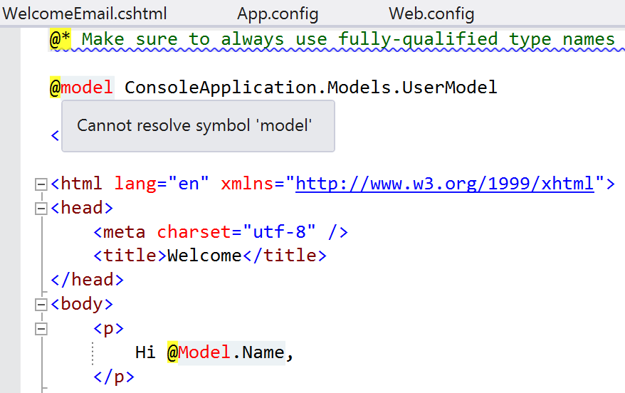 When we edited the Razor template in the previous post, the Visual Studio editor complained about @model with: