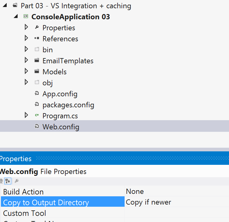 First, we need to ensure that our Web.config file gets deployed alongside the application. If you're within a console, desktop or Windows Service project, the Web.config file is ignored by MSBuild and not deployed by default. All we need to do to fix this is set the Copy to Output Directory property of our Web.config file to Copy if newer: